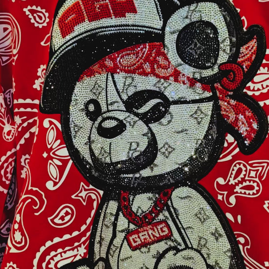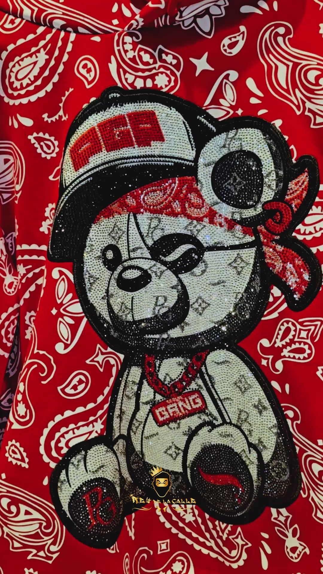 El osito con bandana roja es símbolo de fuerza, pasión y rebeldía. Su diseño en contraste sobre fondo negro crea un look potente y visualmente impactante, ideal para quienes saben que la ropa también habla por ellos.